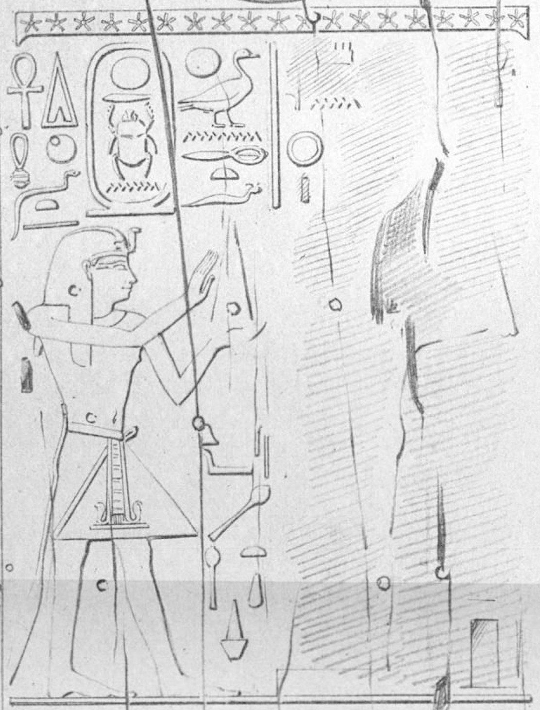 Original: Hatshepsut | Erasures: Thutmose III (figure, names and titles of Hatshepsut) and Amarna period (figure, name and titles of Amun-Ra) | Restorations: Thutmose III (figure, names and titles of Thutmose II) and post-Amarna period (figure, name and titles of Amun-Ra)